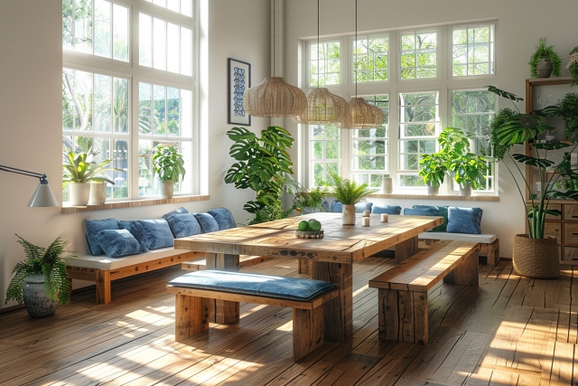 ウンベラータやパキラ、オリーブといった観葉植物を配置することで、室内に自然を取り込めます。木製家具と緑の植物の組み合わせは、北欧らしいナチュラルな雰囲気を強調し、空気清浄効果やリラクゼーション効果も期待できます。鉢カバーも自然素材のバスケットを選ぶことで、より統一感のある空間になります。
