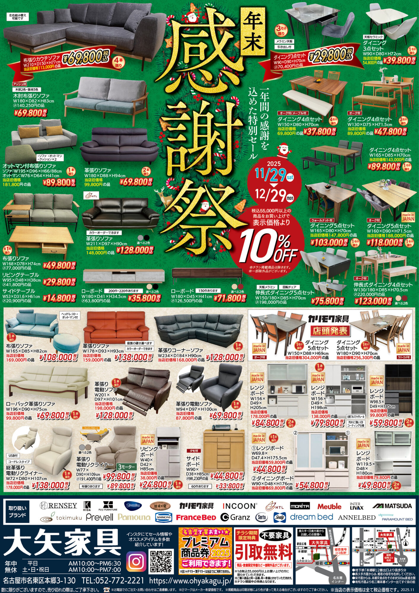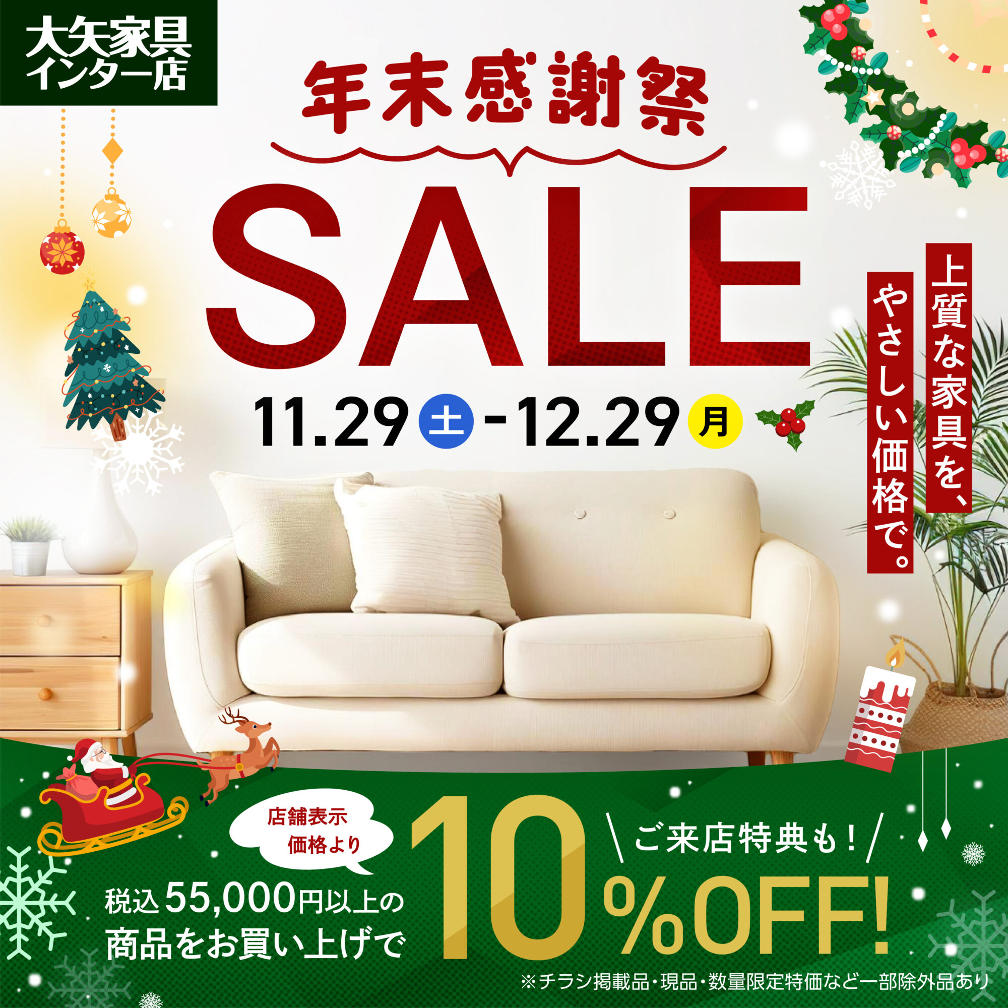 年末感謝祭ならではの厳選したアイテムを種類豊富に取り揃えました。また、一年間の感謝を込めて税込55,000円以上の商品をお買い上げで表示価格より10%OFFにてご提供。※チラシ掲載商品・現品・数量限定特価など一部除外品あり。